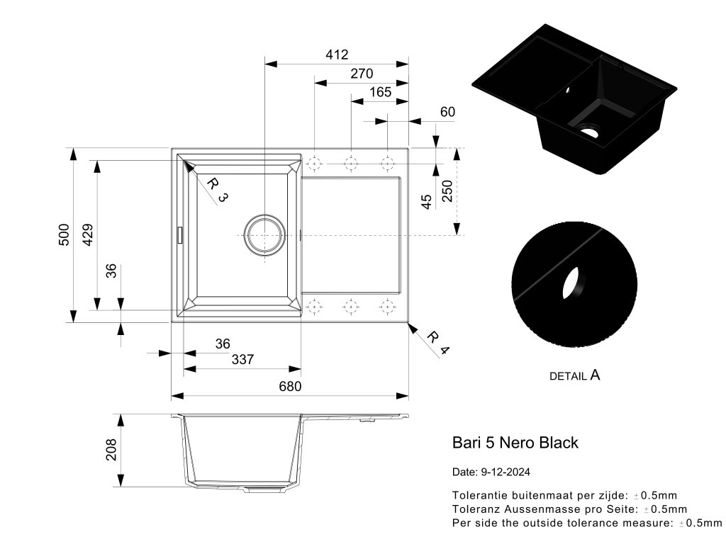 - Celkové rozměry dřezu (ŠxHxV):680 x 500 x 208 mm