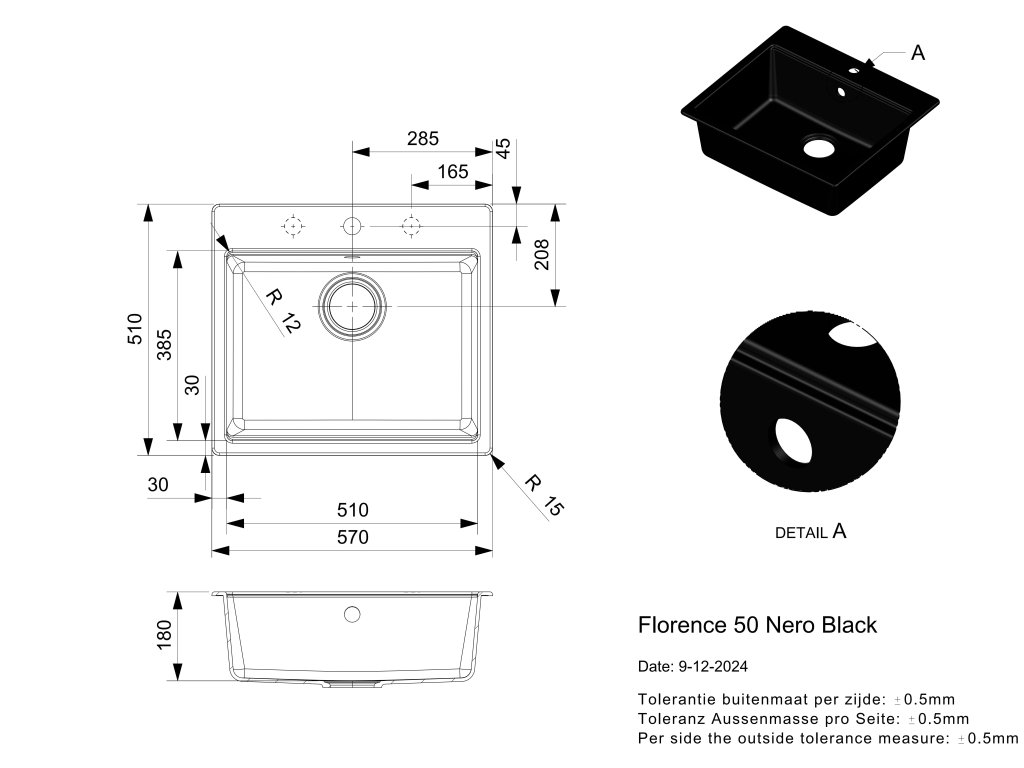 - Celkové rozměry dřezu (ŠxHxV):570 x 510 x 180 mm