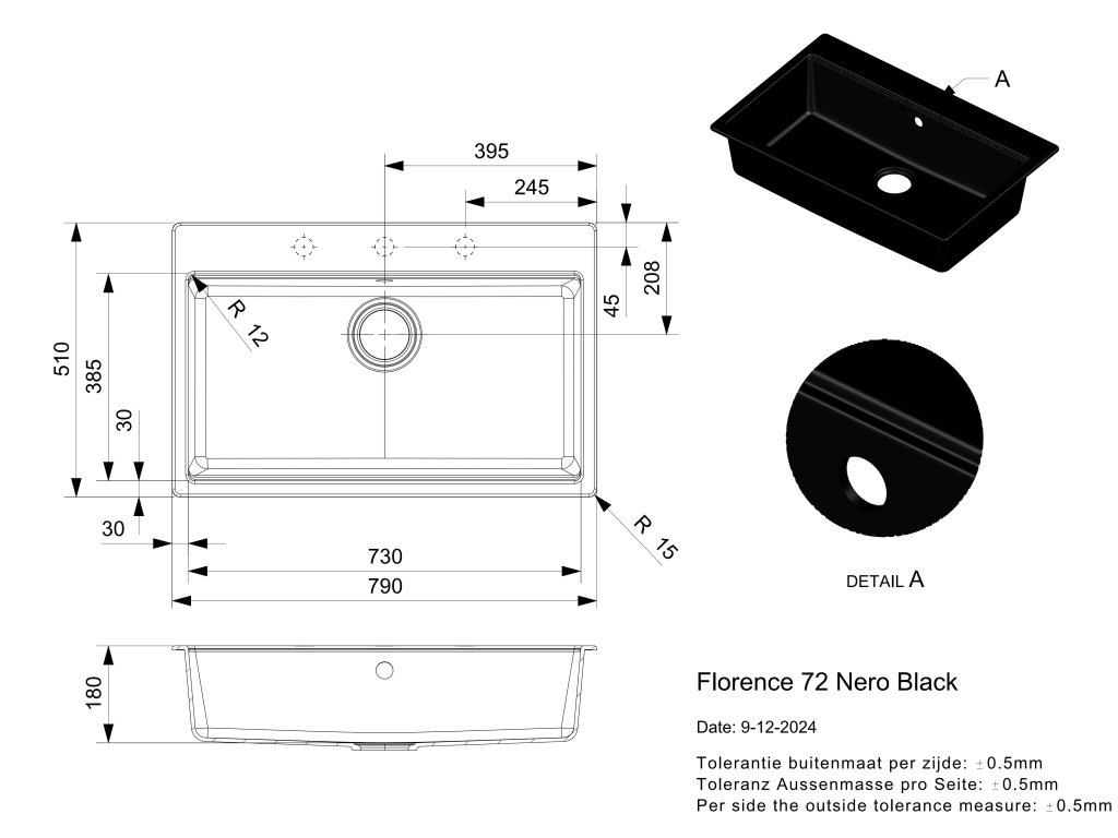 - Celkové rozměry dřezu (ŠxHxV):790 x 510 x 180 mm