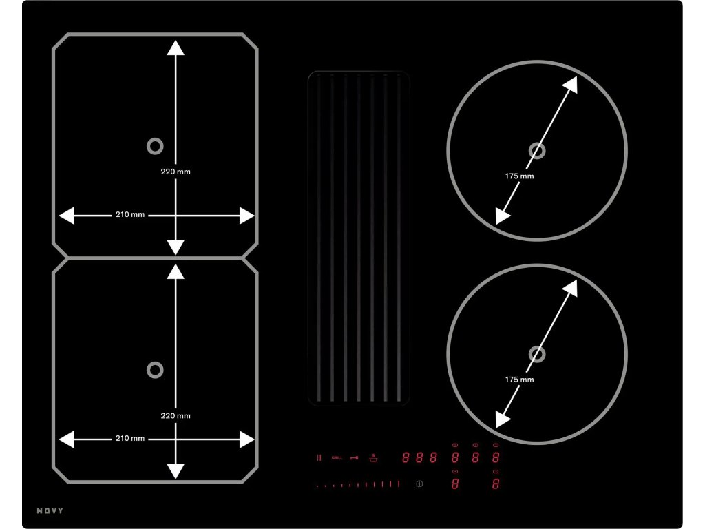 Novy Easy 1871 má 4 plnohodnotné varné zóny při šířce pouhých 65 cm a je určen pro vestavbu do skříňky o šířce 60 cm. Motor odsavače je integrovaný pod indukční deskou, takže je možno využít celou hloubku skříňky. Pod varnou deskou je nutno počítat s prostorem o výšce 24,8 cm pro odsavač par.