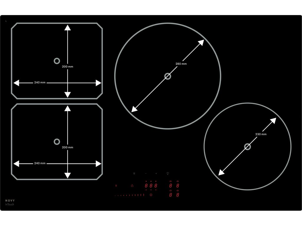 Indukční varné desky řady Power využívají výhod kombinace osmihranných a kulatých varných zón. Osmihranné (oktagonální) zóny nabízí funkci Bridge, tedy spojení dvou flexi zón, což je vhodné zejména pro větší pánve a pekáče. Indukční desky Novy Power jsou vybaveny pohodlným "slider" ovládáním s červenými displeji.
