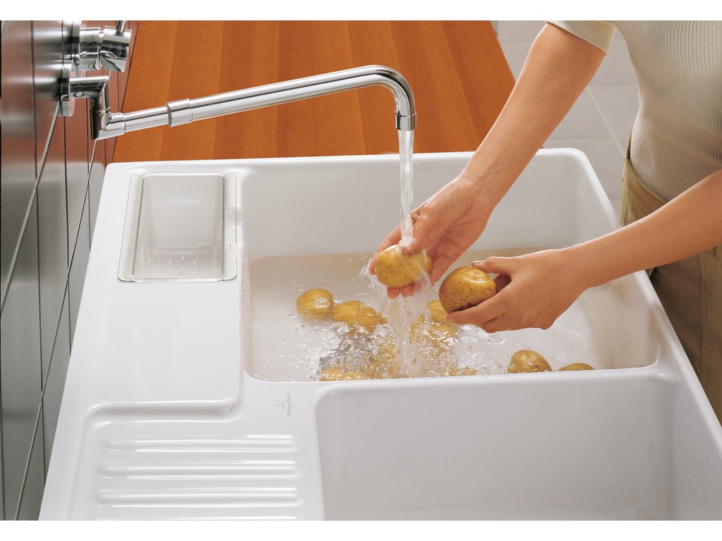 Keramický dřez Villeroy & Boch Architectura je vyroben z materiálu CeramicPlus, který zajišťuje vyjímečnou tvrdost, odolnost proti poškrábání nebo jinému poškození a také odolnost proti vysokým teplotám. Povrch je odolný proti cizím látkám a nečistotám, takže se výborně čistí a potraviny na něm nezanechávají žádné stopy. Materiál CeramicPlus je vyroben ze 100% přírodních materiálů, je barevně stálý a nepřijímá chutě ani zápachy, takže ja absolutně nezávadný pro potraviny.