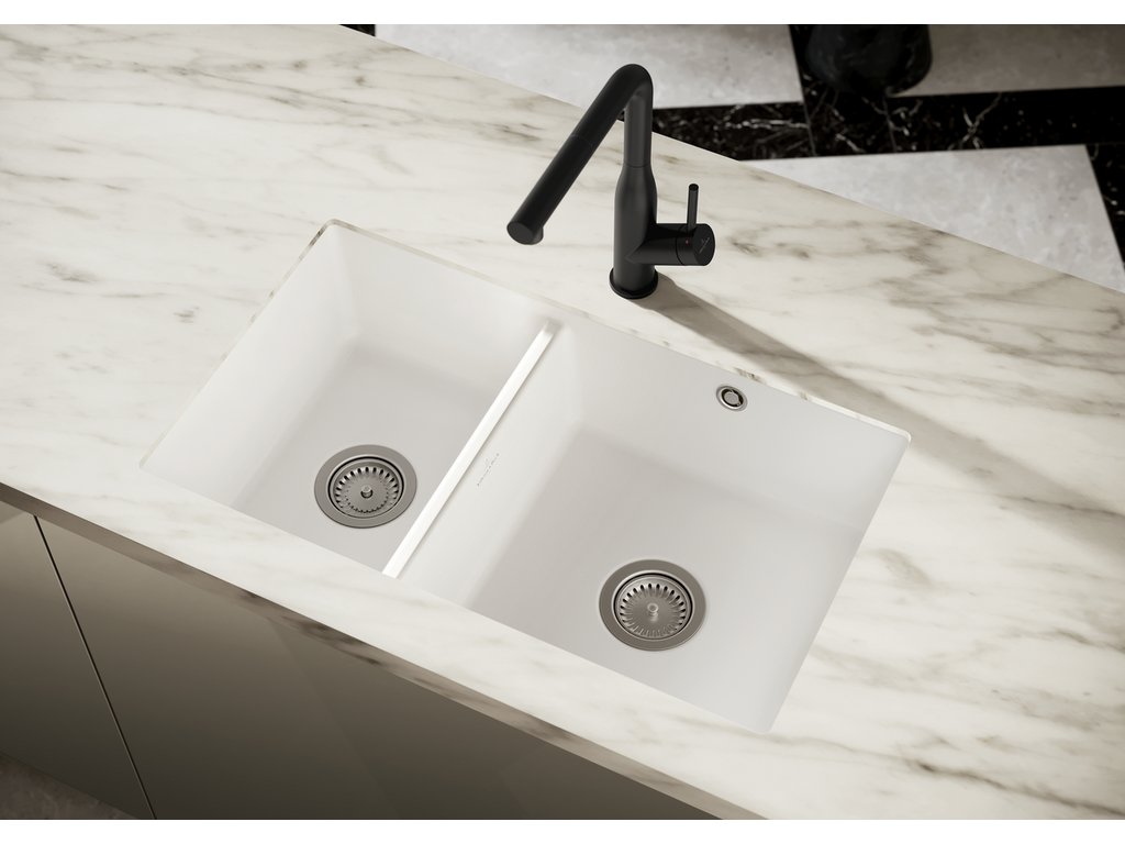 Keramický dřez Villeroy & Boch Subway je vyroben z materiálu CeramicPlus, který zajišťuje vyjímečnou tvrdost, odolnost proti poškrábání nebo jinému poškození a také odolnost proti vysokým teplotám. Povrch je odolný proti cizím látkám a nečistotám, takže se výborně čistí a potraviny na něm nezanechávají žádné stopy. Materiál CeramicPlus je vyroben ze 100% přírodních materiálů, je barevně stálý a nepřijímá chutě ani zápachy, takže ja absolutně nezávadný pro potraviny.