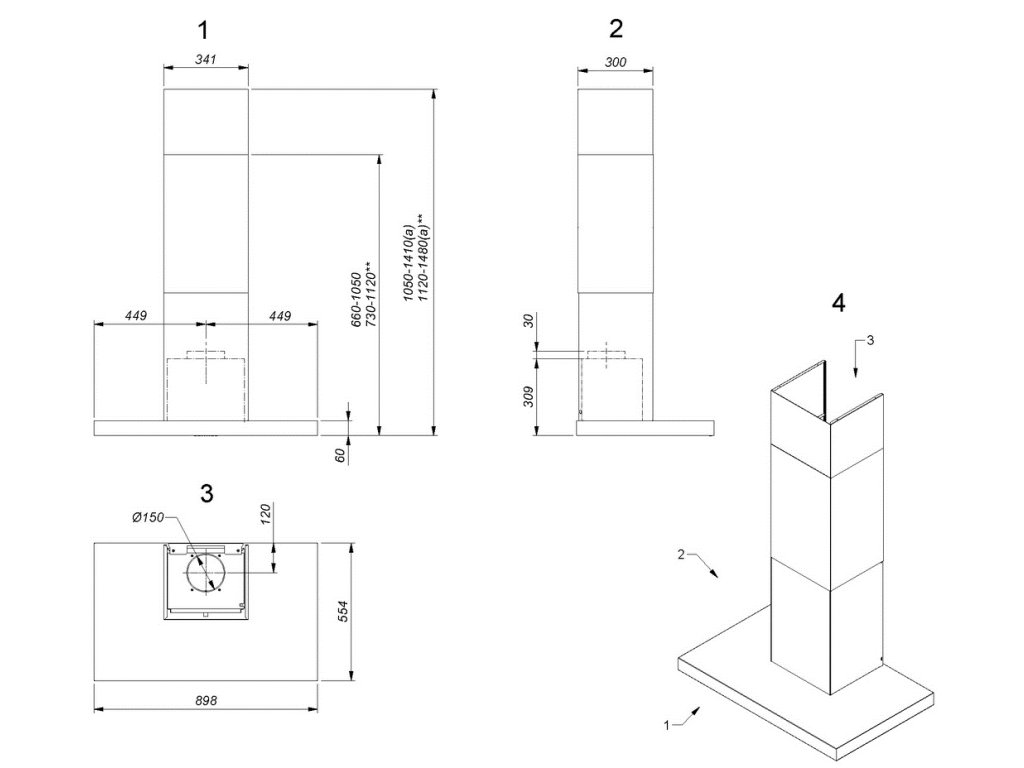 - Rozměry odsavače s prodlužovacím komínkem 7602150 (ŠxHxV): 898 x 554 x 1050 - 1410